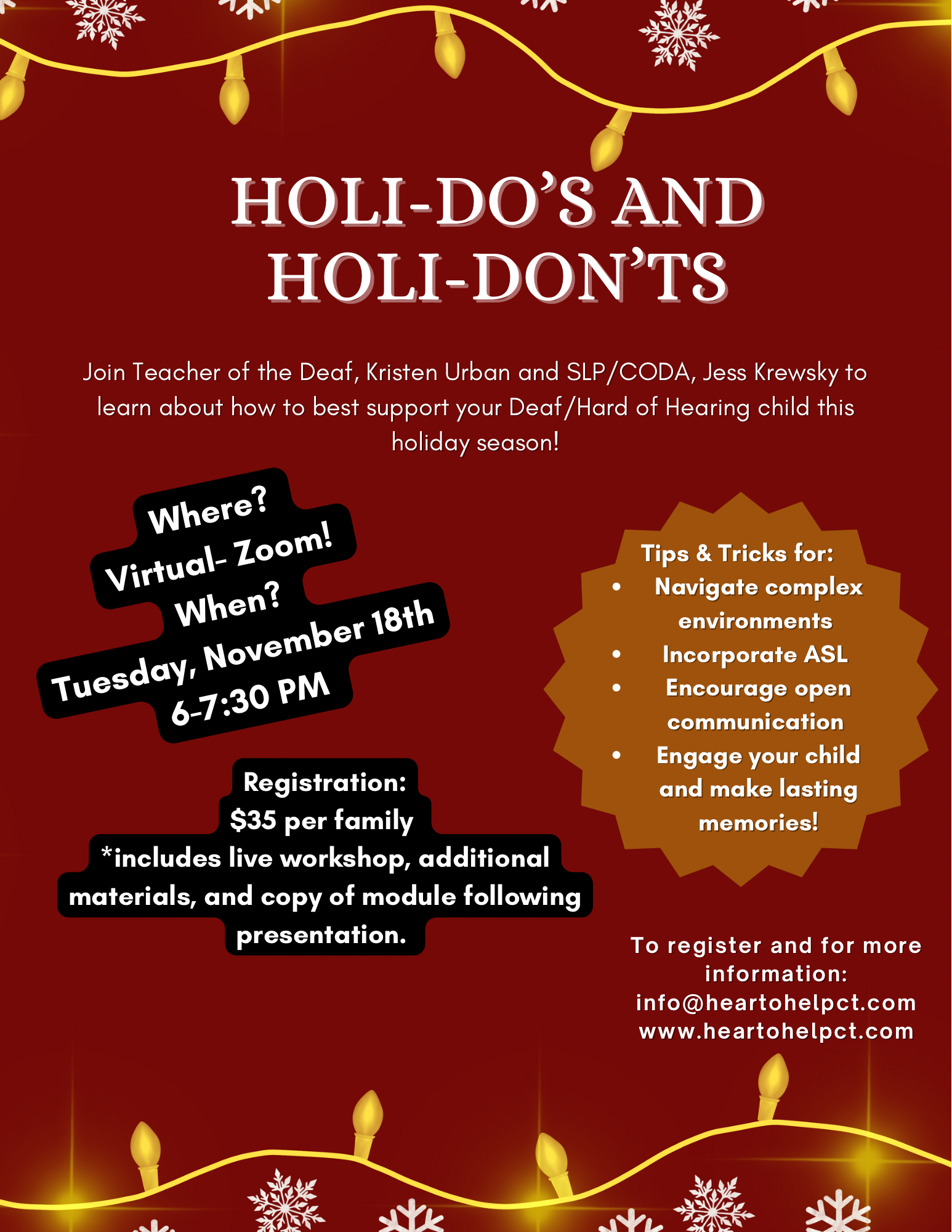 At *Hear to Help*, our mission is to empower families of children who are Deaf and Hard of Hearing by providing compassionate support, individualized guidance, and access to meaningful resources. We are dedicated to helping families feel confident and well-equipped to understand and support their child—no matter the circumstance. Our goal is to offer tools and strategies that align with your family’s unique needs and values, laying a strong foundation for lifelong growth and success. Beyond our direct support, we strive to foster lasting connections between families and their communities, encouraging collaboration with local programs, Birth to Three agencies, and school districts. At *Hear to Help*, we believe every family deserves to feel supported, informed, and empowered to advocate for their child’s full potential.